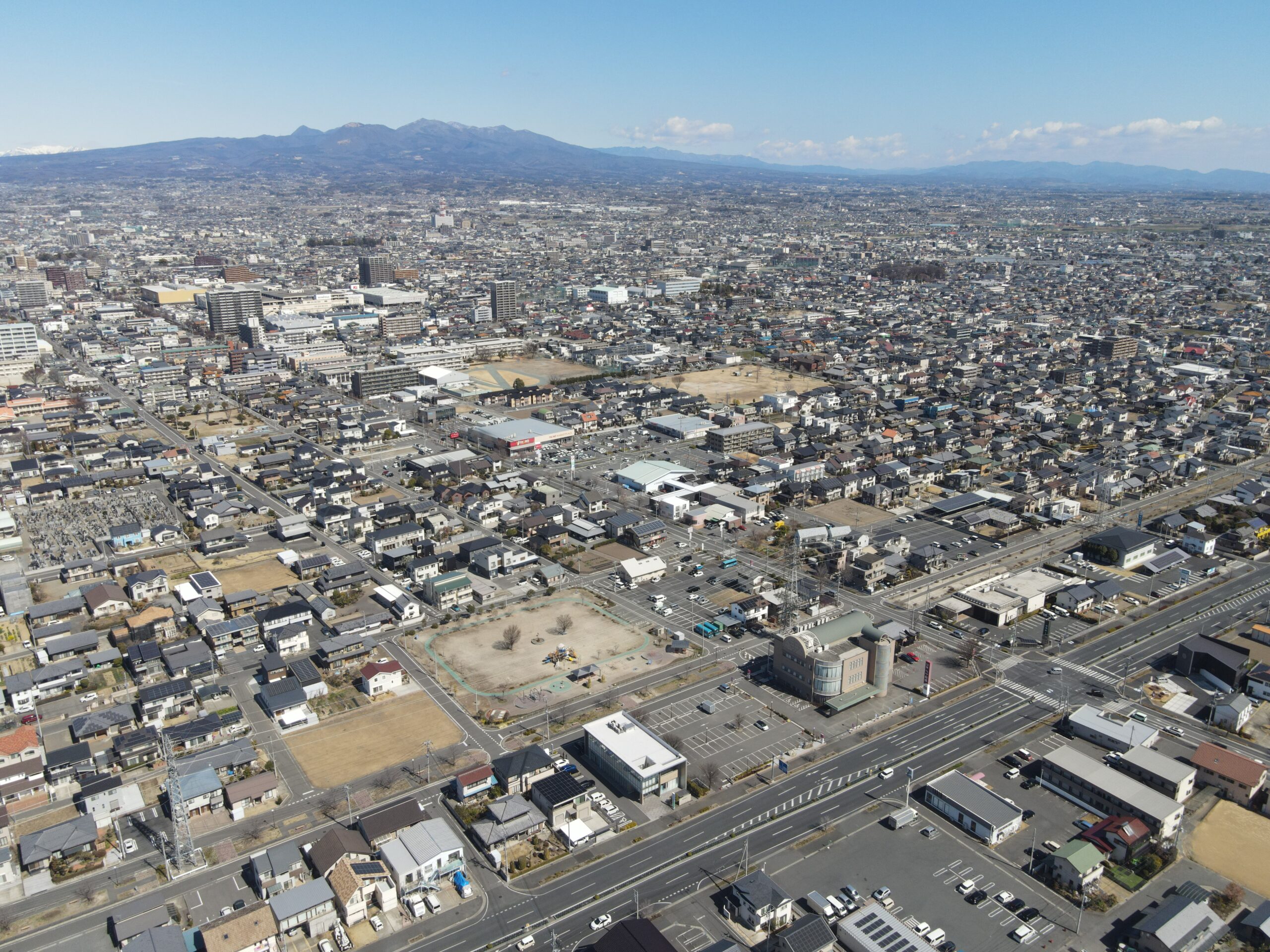 前橋市内に位置する金融機関様の外観および周辺環境を空撮いたし